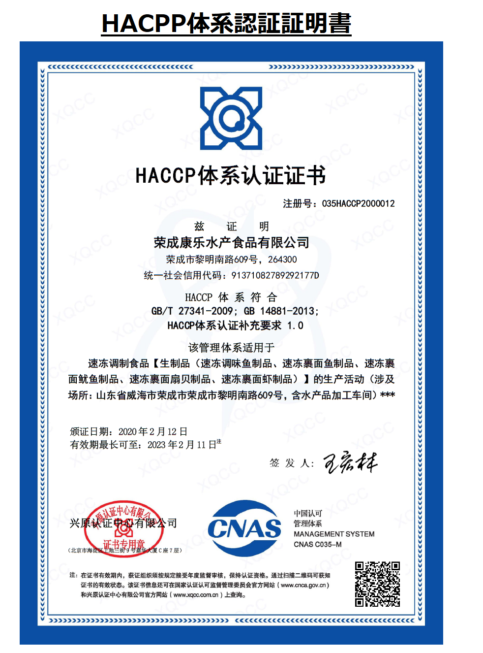 HACPP体系認証証明書